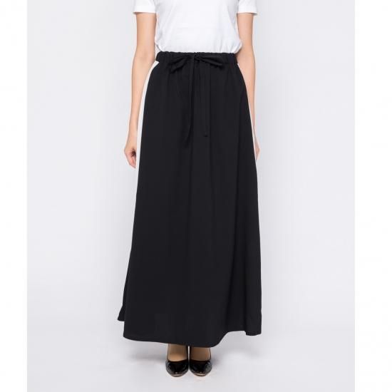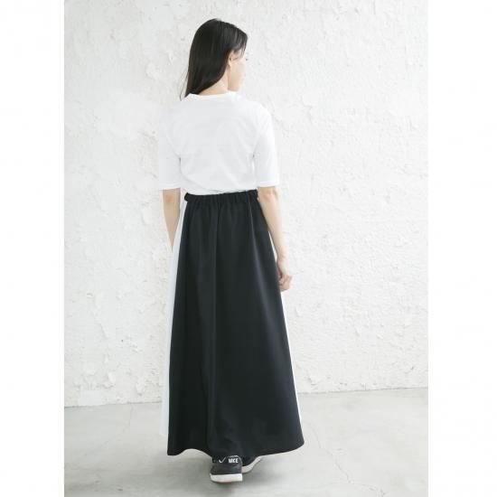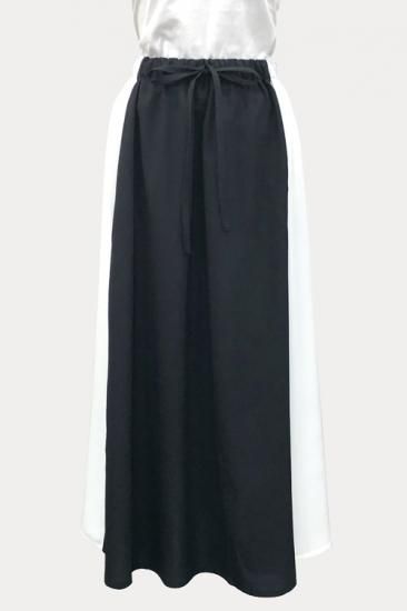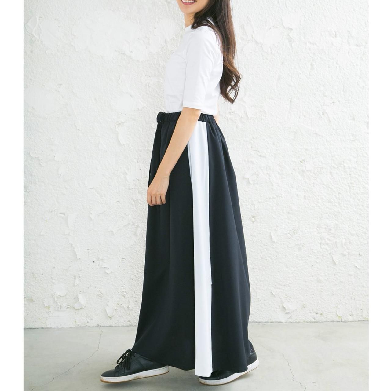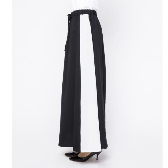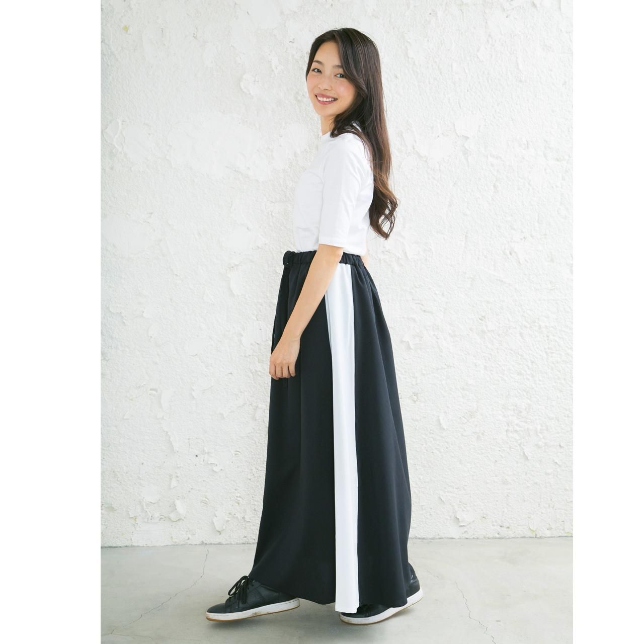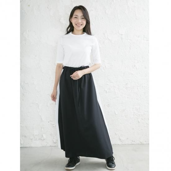 フレアータイプのマキシ丈スカートのサイドに白いラインを入れました。ウエストゴム入りなのでらくちん。制電効果のあるアムンゼン素材の仕様です。表面に梨地のような織り目のある生地です。モデル身長160cm