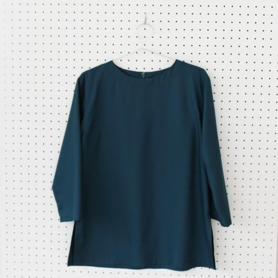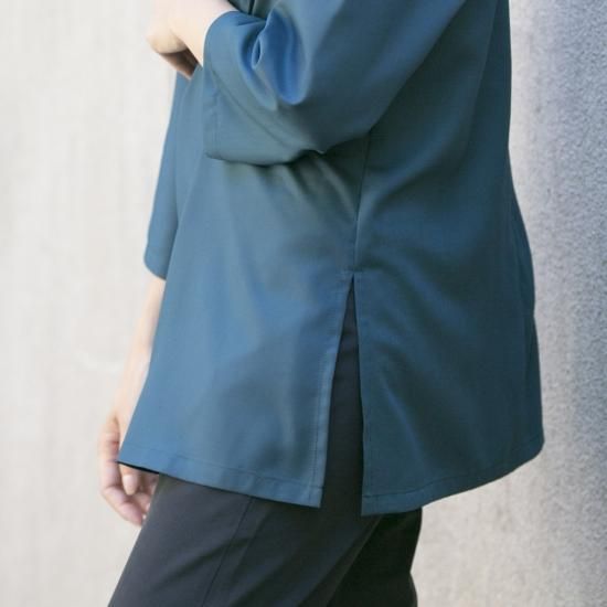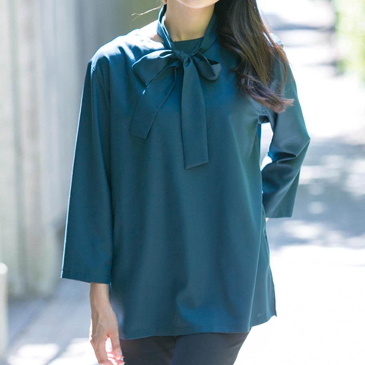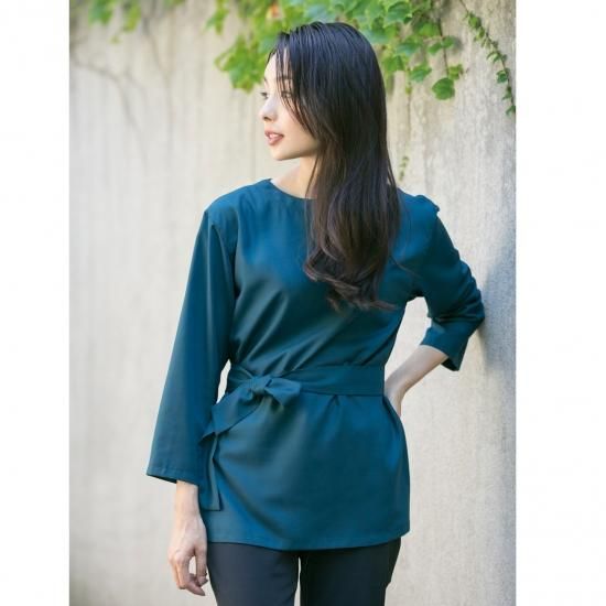 シンプルなデザインの新ブラウスは、付属のリボンで雰囲気が変化。襟元で結ぶとブラウス風に、ウエストで結ぶとチュニック風な着こなしに。サイドスリットもあるので動きやすさもあります。生地は薄手でマットな質感、適度なハリのあるポリエステルです。