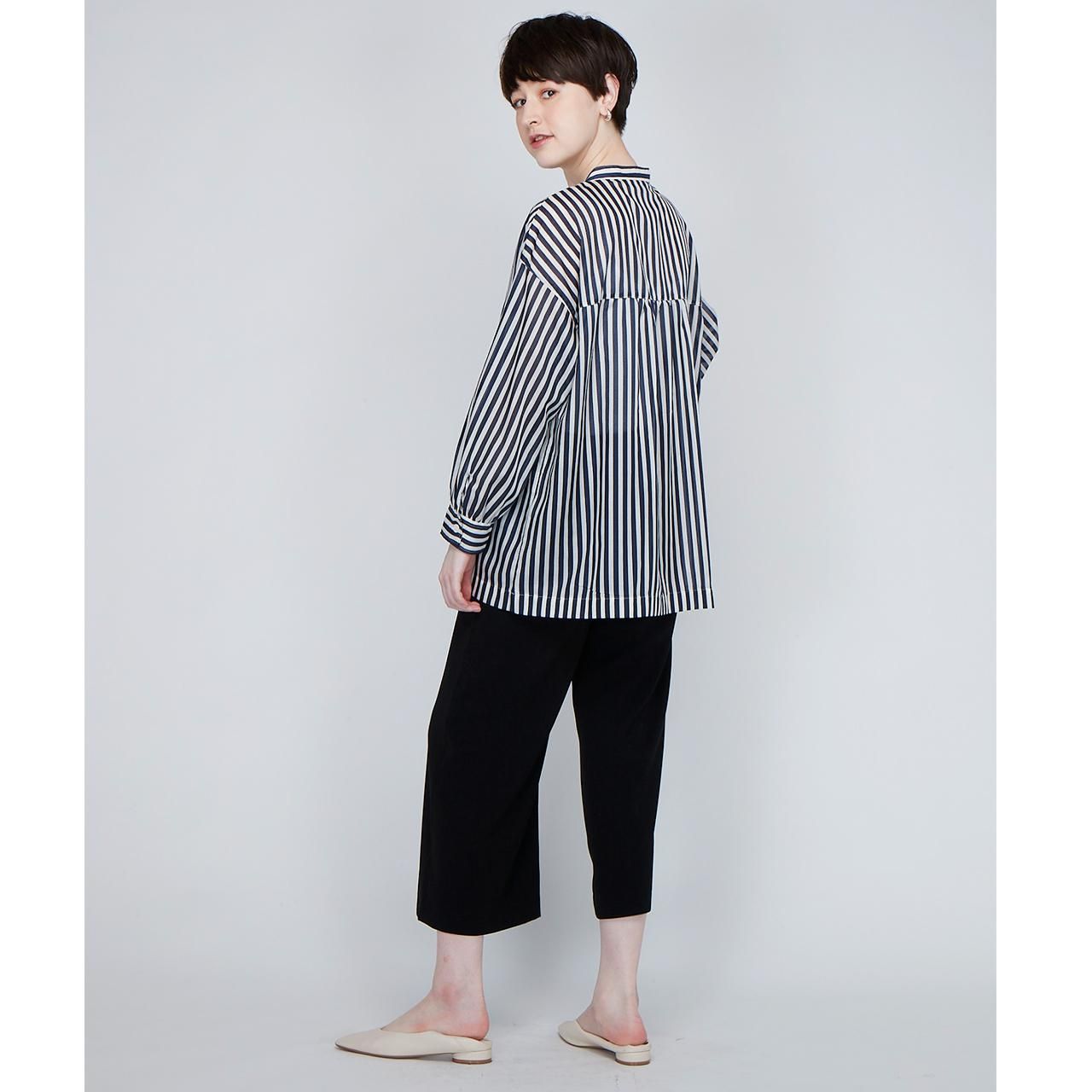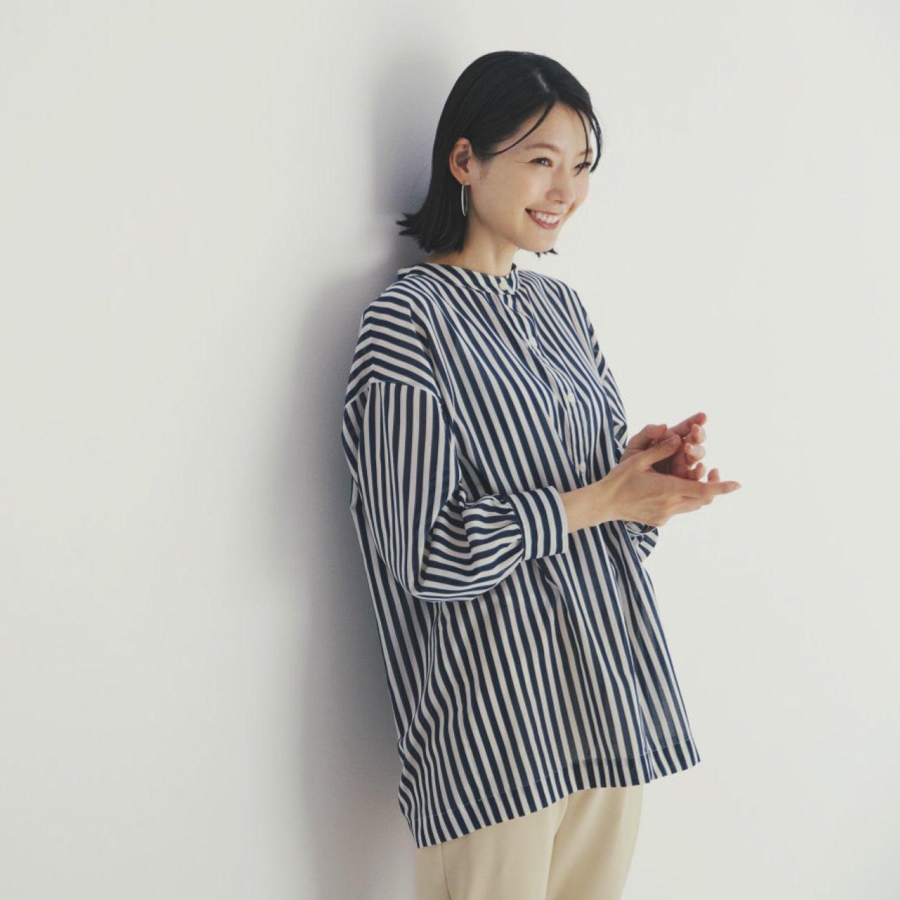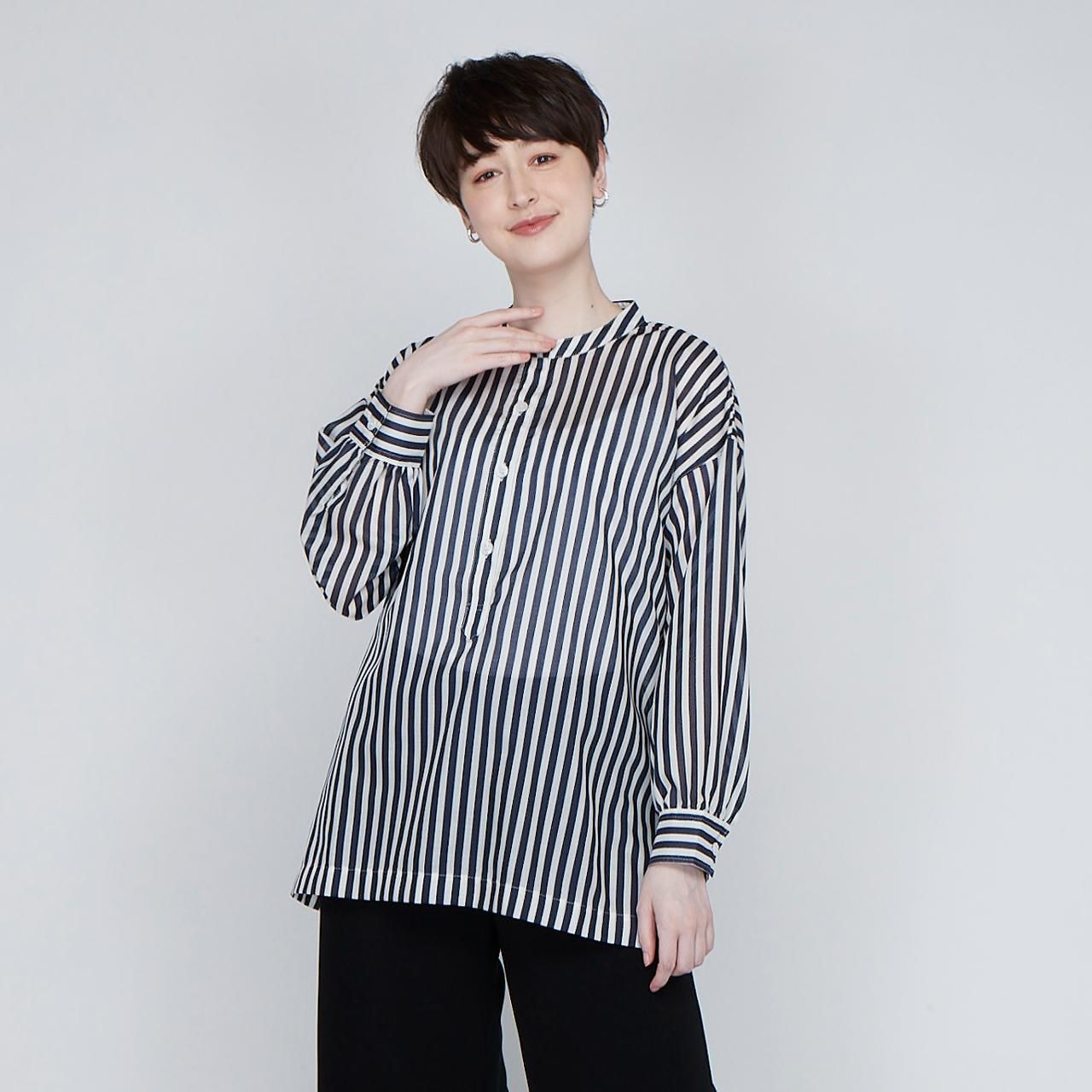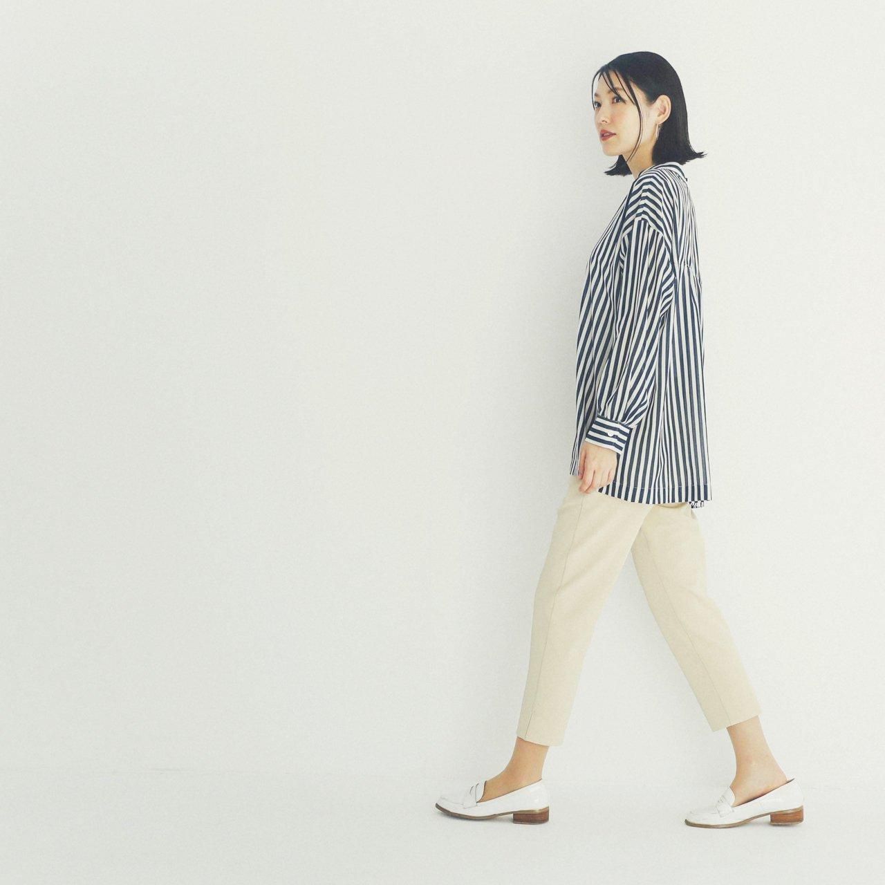 バルーン袖は腕を動かしやすく、仕事着に人気のデザインです。新素材は、薄手で透け感のあるストライプ柄。上半身に軽さが出て、華奢に見える効果もありそう。メリハリのあるストライプのピッチも絶妙。インにもアウトにも使いやすいのでコーディネートにバリエーションが生まれます。