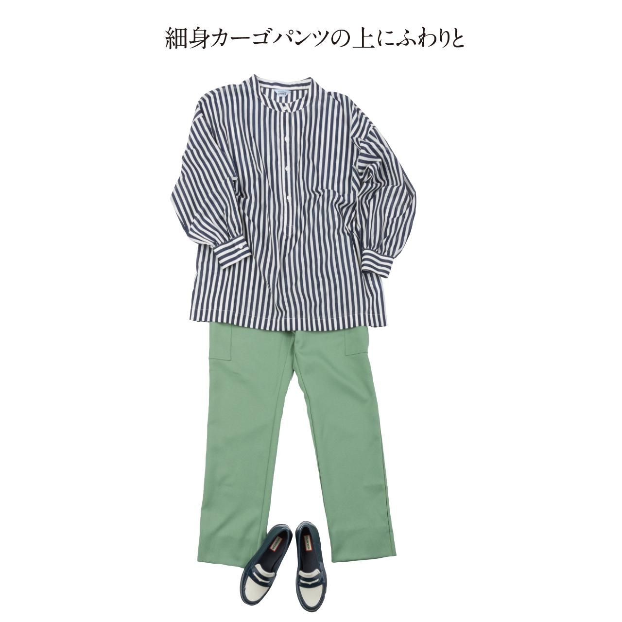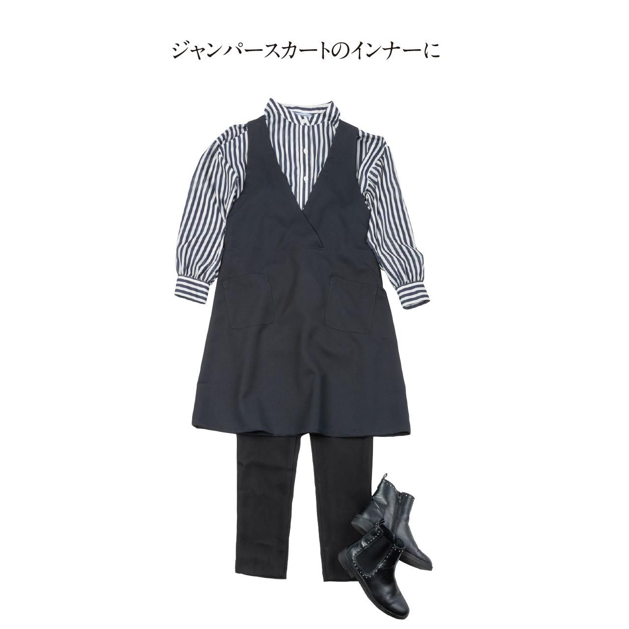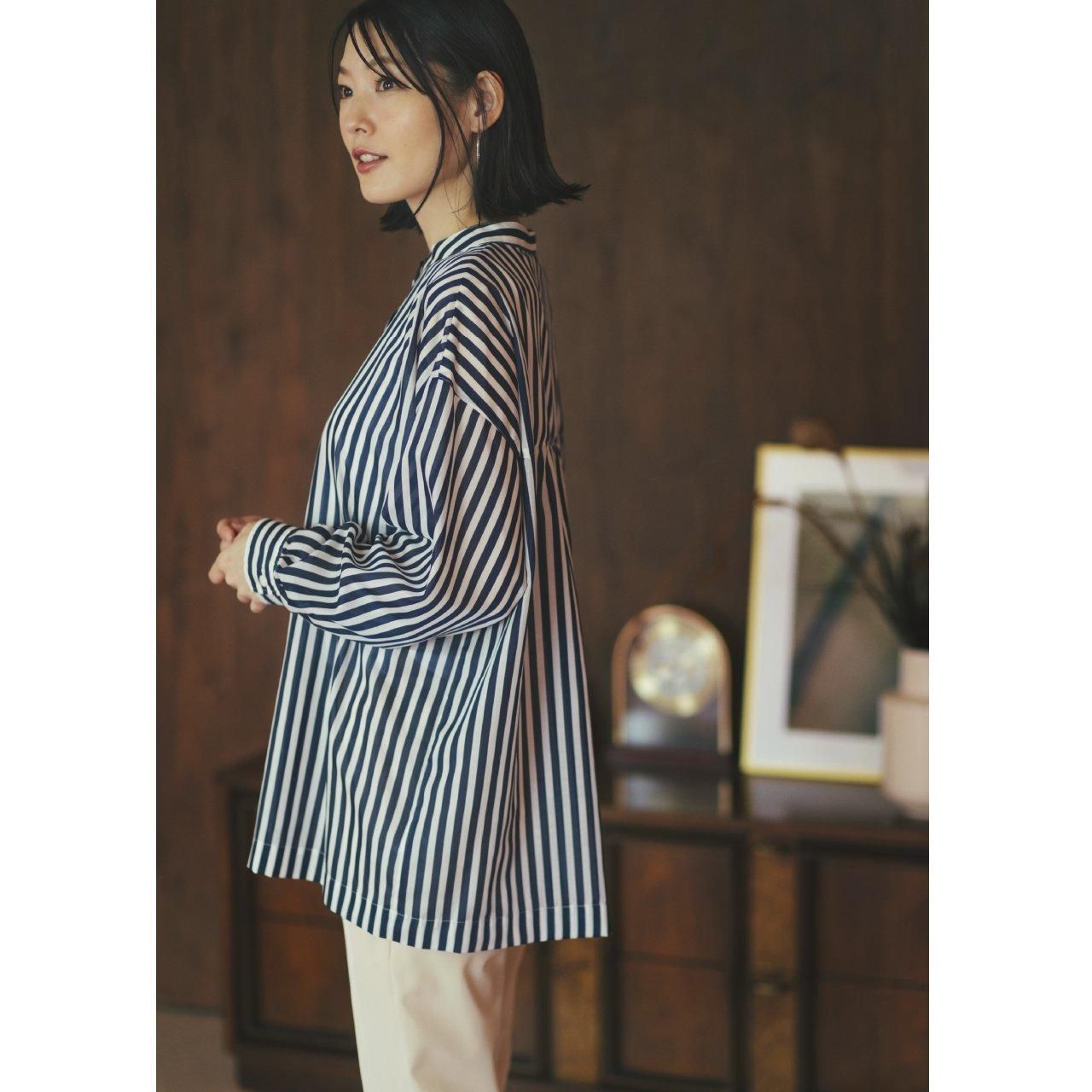 バルーン袖は腕を動かしやすく、仕事着に人気のデザインです。新素材は、薄手で透け感のあるストライプ柄。上半身に軽さが出て、華奢に見える効果もありそう。メリハリのあるストライプのピッチも絶妙。インにもアウトにも使いやすいのでコーディネートにバリエーションが生まれます。