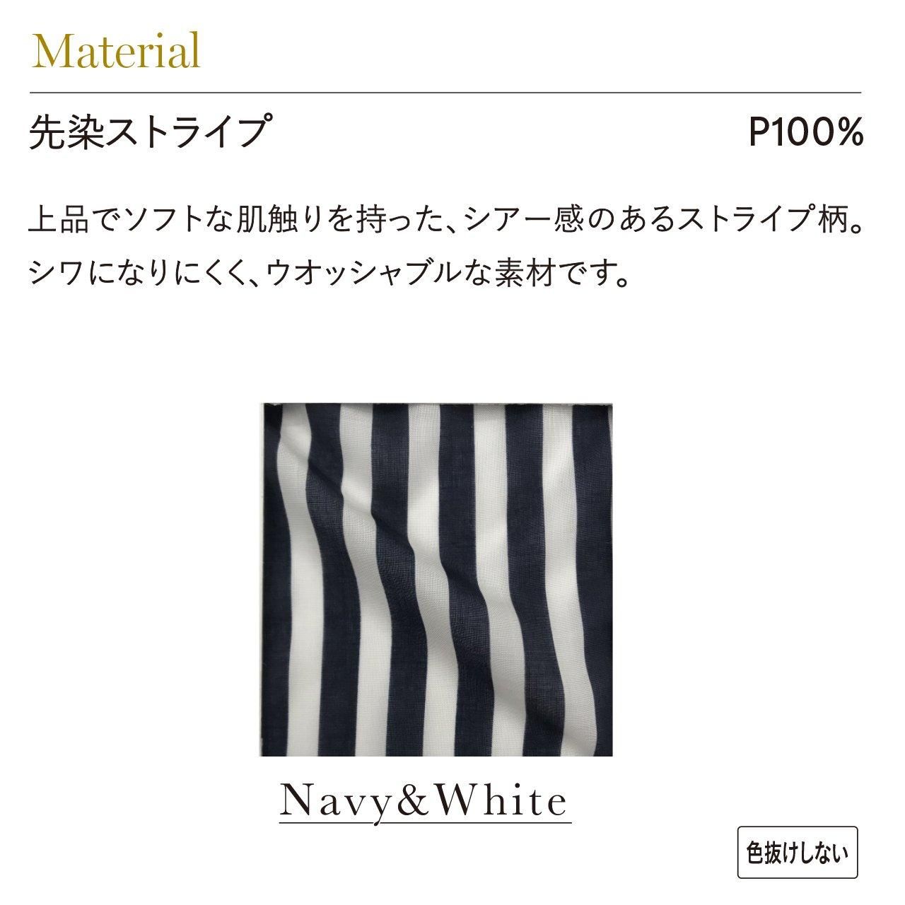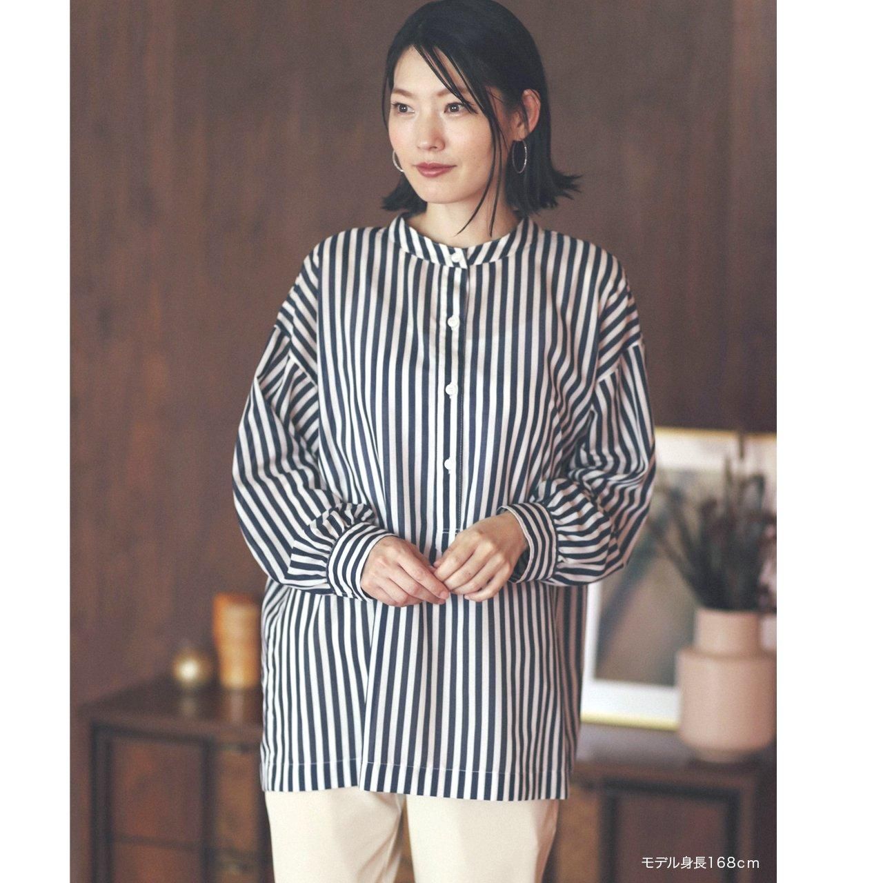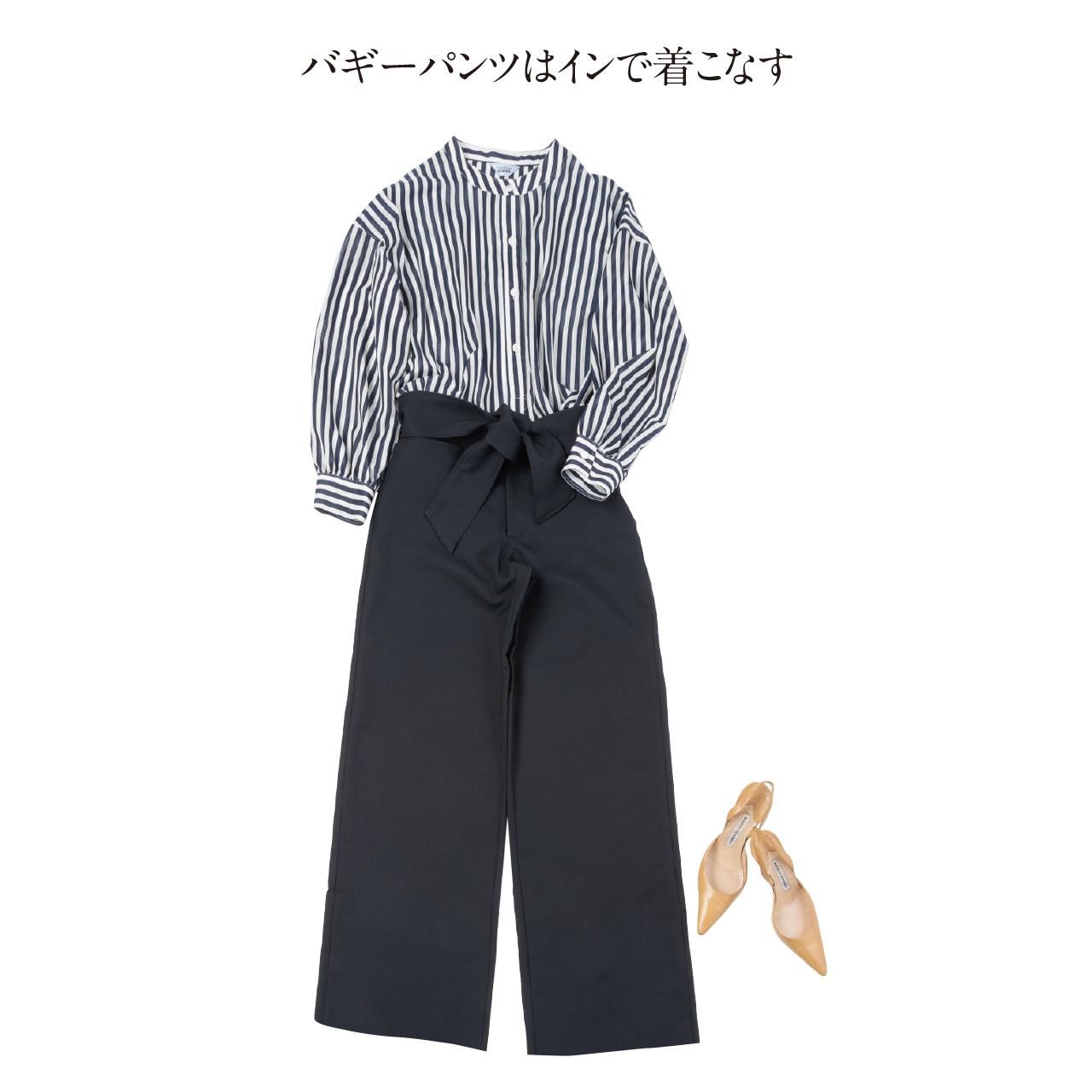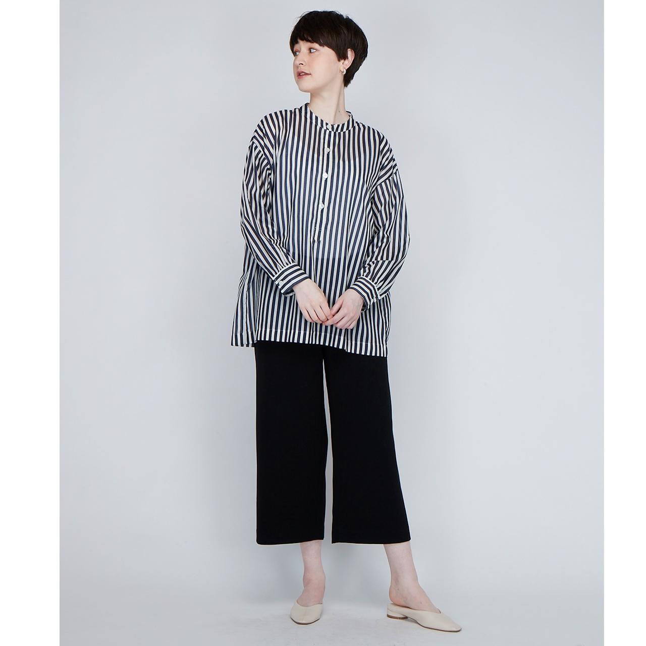 バルーン袖は腕を動かしやすく、仕事着に人気のデザインです。新素材は、薄手で透け感のあるストライプ柄。上半身に軽さが出て、華奢に見える効果もありそう。メリハリのあるストライプのピッチも絶妙。インにもアウトにも使いやすいのでコーディネートにバリエーションが生まれます。
