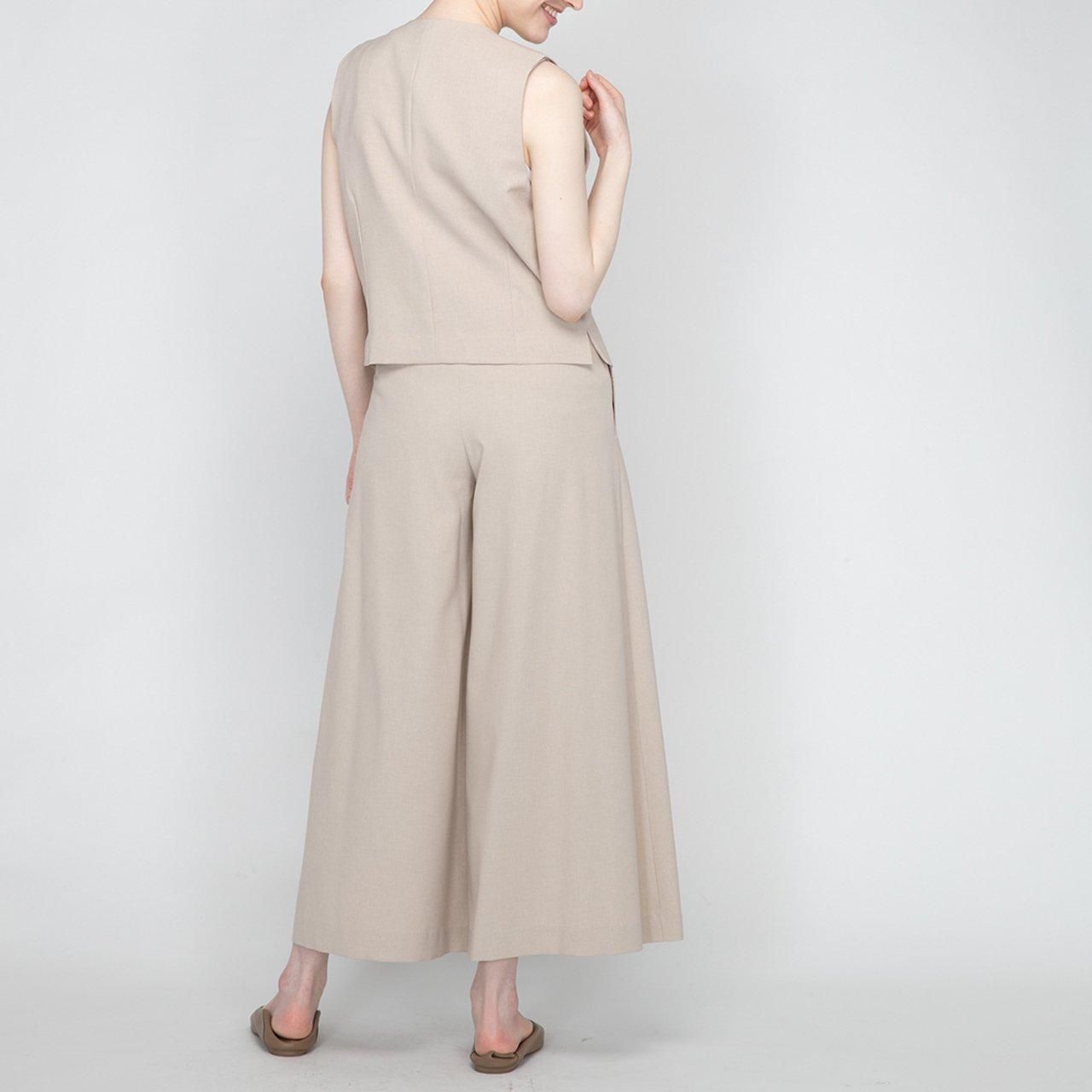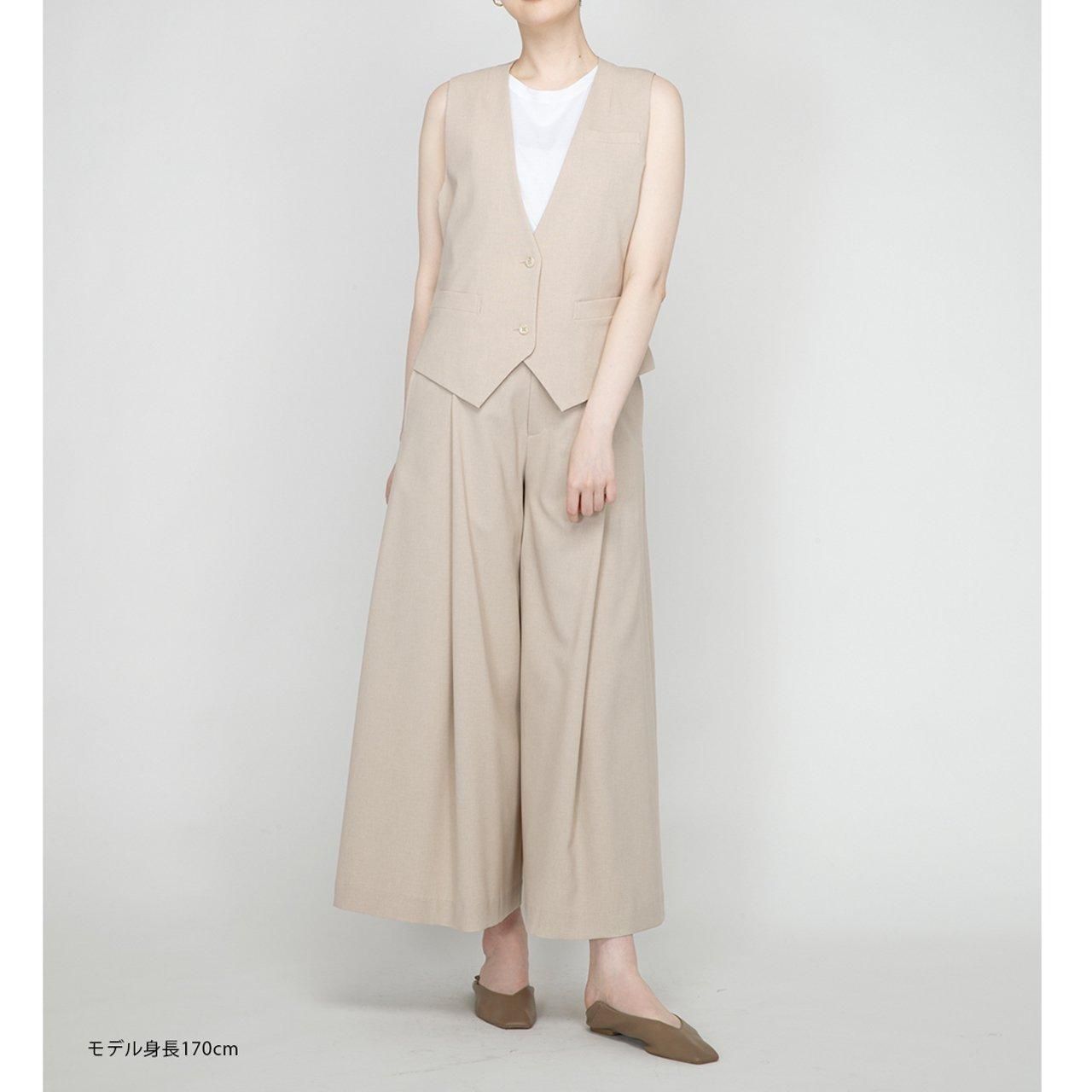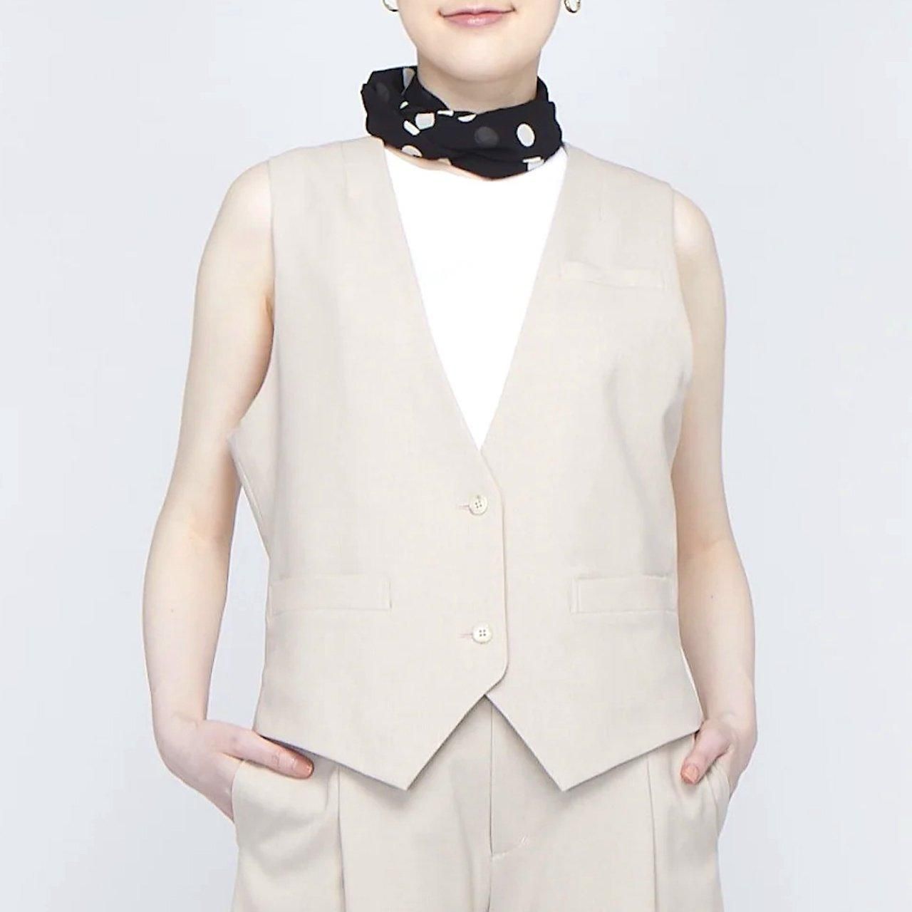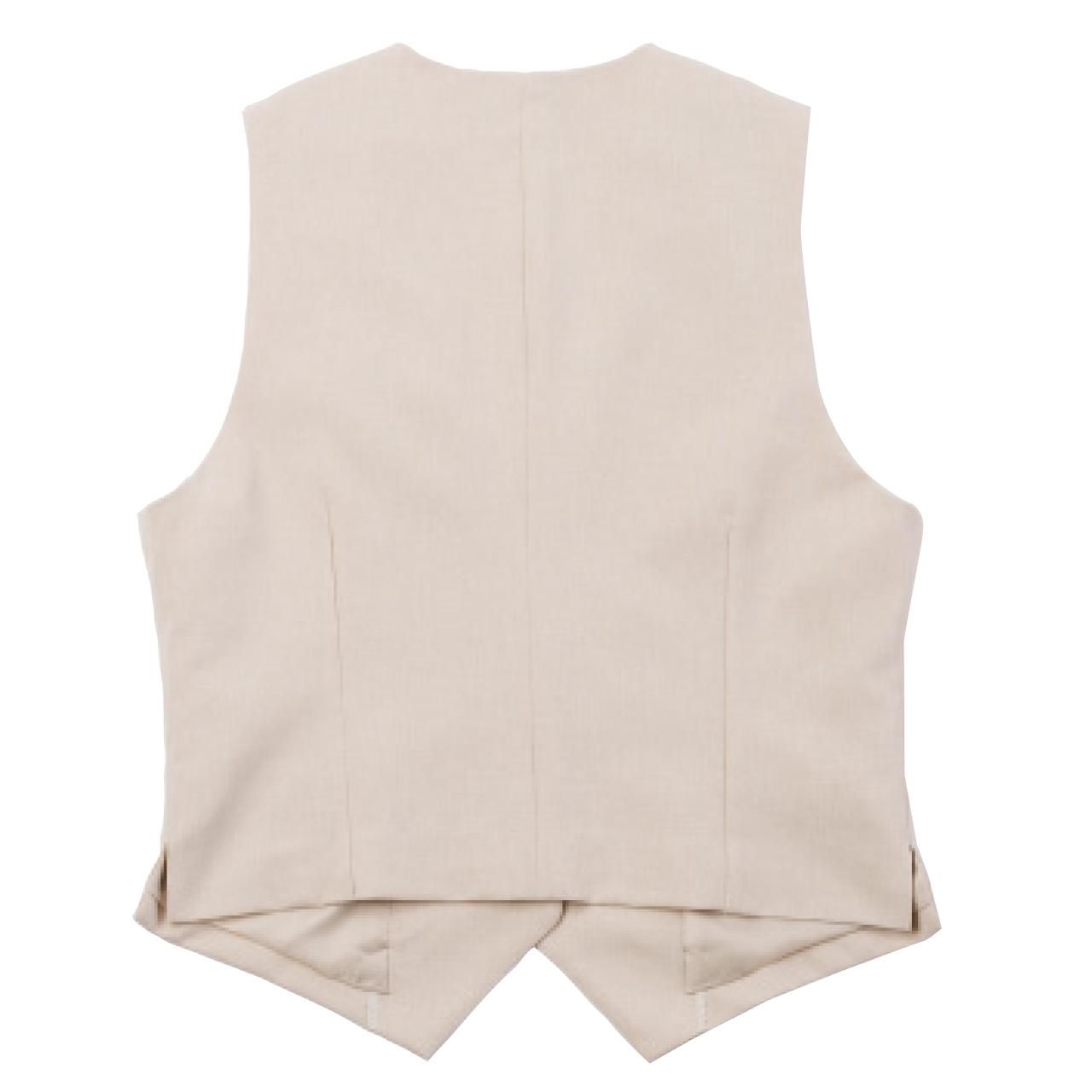 撥水効果もあり、リネンのような質感が心地いいベスト。前開き2つボタンで両脇にスリット入りの新デザイン。夏場のTシャツ×パンツを合わせるだけのコーディネートはややラフすぎる、そんな時に使える1枚です。薬剤による色抜けもしにくい生地です。