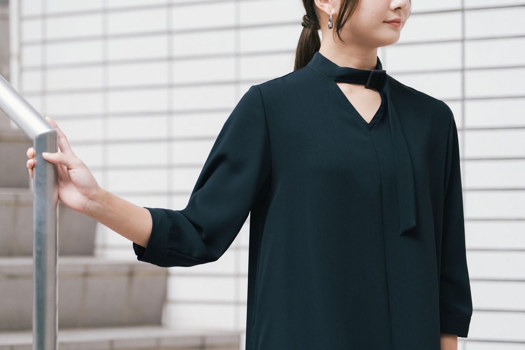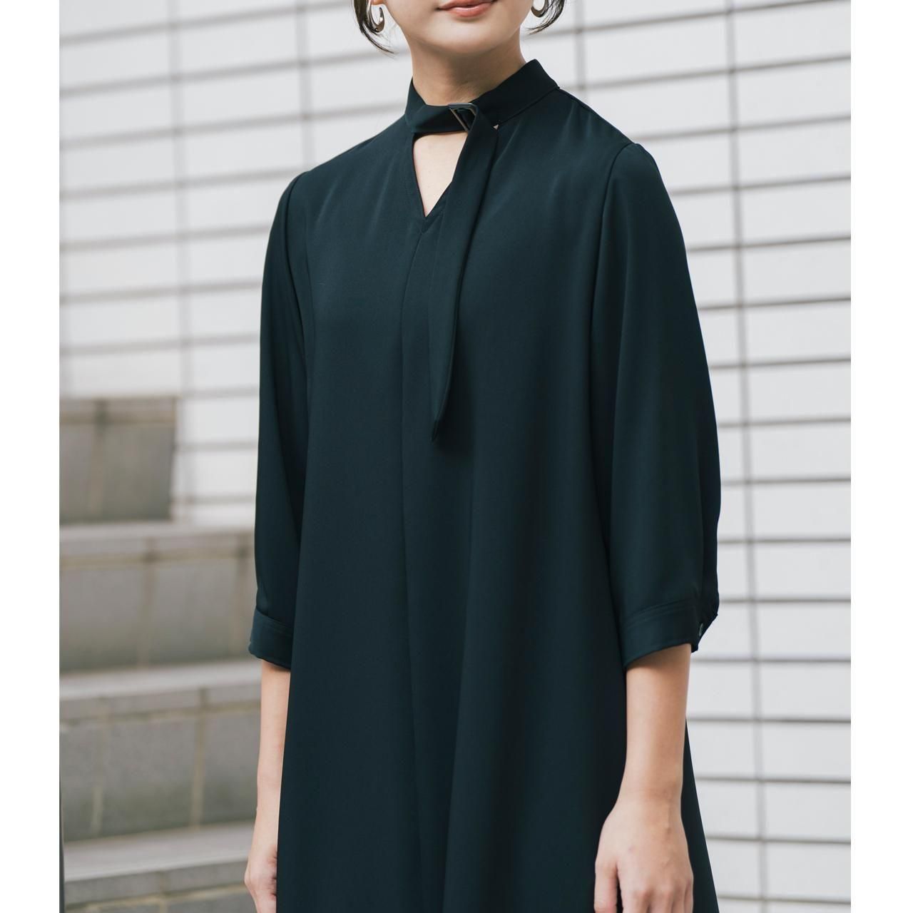 シンプルなAラインのロングワンピース衿にワンポイントつけた新デザインです。胸元の小さなV開きが顔まわりをシャープに見せてくれます。服自体がシンプルな分、手元や足元など自分らしくコーディネートできそうです。